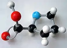 The model shown to the left represents a ball-and-stick model of proline. The balls have colours: black represents carbon (C); red, oxygen (O); blue, nitrogen (N); and white, hydrogen (H). Each ball is drilled with as many holes as its conventional valence (C: 4; N: 3; O: 2; H: 1) directed towards the vertices of a tetrahedron. Single bonds are represented by (fairly) rigid grey rods. Double and triple bonds use two longer flexible bonds which restrict rotation and support conventional cis/trans stereochemistry.