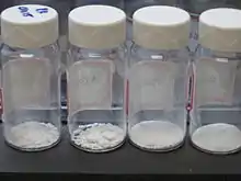 Production of 4Å sieve is relatively straightforward as it requires neither high pressures nor particularly high temperatures. Typically aqueous solutions of sodium silicate and sodium aluminate are combined at 80 °C. The solvent-impregnated product is "activated" by "baking" at 400 °C[16] 4A sieves serve as the precursor to 3A and 5A sieves through cation exchange of sodium for potassium (for 3A) or calcium (for 5A)[17][18]
