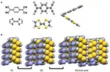 Coulombic interactions are manifested in some molecular solids. A well-studied example is the radical ion salt TTF-TCNQ with a conductivity of 5 x 102 Ω−1 cm−1,[5] much closer to copper (ρ = 6 x 105 Ω−1 cm−1)[8] than many molecular solids.[31][18][30] The coulombic interaction in TTF-TCNQ stems from the large partial negative charge (δ = -0.59) on the cyano- moiety on TCNQ at room temperature.[5] For reference, a completely charged molecule δ = ±1.[5] This partial negative charge leads to a strong interaction with the thio- moiety of the TTF. The strong interaction leads to favorable alignment of these functional groups adjacent to each other in the solid state.[5][30] While π-π interactions cause the TTF and TCNQ to stack in separate columns.[10][30]