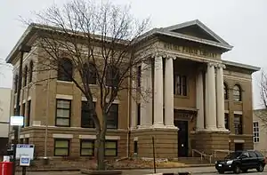 By the 1920s the downtown area featured bank buildings that contained office space on multiple floors above the main banking rooms on the first floor, as well as other office buildings. These buildings provided a variety of professional services. Two of the buildings were eight stories tall, the Fifth Avenue Building and a building that is now houses Chase Bank. The LeClaire Hotel, which opened in 1922, anchored the east side of the downtown area. On the west side of downtown is the imposing First Lutheran Church, which was built in 1876. Department stores, first-floor specialty shops, theaters, hotels, restaurants, and bars rounded out the businesses. Institutional structures such as the Carnegie Library (1904), City Hall (1914), Elks Club (1924), and the Unitarian Church (1928) were also built in the downtown business district.[2]