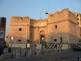 Almost nothing remains of the oldest city wall, called "Carolingian" (9th century), but large section of the 12th century Barbarossa's walls are well preserved (Grazie and Marina walls). Some remains on the east side of the hill of Castello ("Murette del Colle") came to light after the World War II bombing that destroyed the houses in which they were incorporated.[2] The best known gate in Barbarossa's walls is Porta Soprana on the border between the neighbourhoods of Molo and Portoria; this gate, restored at the end of the 19th century and again in 1938, has a monumental look, with high semicircular towers.