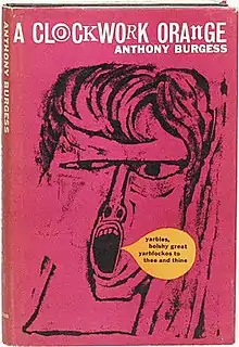 A Clockwork Orange is a dystopian satirical black comedy novel by English writer Anthony Burgess, published in 1962. It is set in a near-future society that has a youth subculture of extreme violence. The teenage protagonist, Alex, narrates his violent exploits and his experiences with state authorities intent on reforming him.[1] The book is partially written in a Russian-influenced argot called "Nadsat", which takes its name from the Russian suffix that is equivalent to '-teen' in English.[2] According to Burgess, it was a jeu d'esprit written in just three weeks.[3]