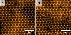 ![]() Top-view atomic images of MoSe2 before and after (right) ion irradiation[1] | |