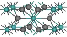 Molybdenum disilicide (MoSi2, or molybdenum silicide), an intermetallic compound, a silicide of molybdenum, is a refractory ceramic with primary use in heating elements. It has moderate density, melting point 2030 °C, and is electrically conductive. At high temperatures it forms a passivation layer of silicon dioxide, protecting it from further oxidation. The thermal stability of MoSi2 alongside its high emissivity make this material, alongside WSi2 attractive for applications as a high emissivity coatings in heat shields for atmospheric entry.[3] MoSi2 is a gray metallic-looking material with tetragonal crystal structure (alpha-modification); its beta-modification is hexagonal and unstable.[4] It is insoluble in most acids but soluble in nitric acid and hydrofluoric acid.