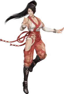 Momiji is a tall, young girl with amber eyes and long black hair tied in a ponytail. Her measurements are B92 / W58 / H88 and she is 21-years-old in DOAX3.[32] Originally she wore a white Hayabusa ninja training[33] outfit with greenish-black hair, but starting in Sigma 2 she has black hair. Momiji usually wears minimal armor for mobility.[34] By Sigma 2, her main[35] costume became a revealing[36] battle-priestess outfit where the colors red and white represent dragon's flame and purification.[33] Her alternative costumes in the game, "designed for action and style,"[37] include a variation of her shrine maiden costume that "mixes a skirt with a traditional ceremonial top," an "easy-to-move clothing for combat whose violet design still maintains a sense of serenity," and a "traditional clothing for those taking part in secular festivals"[38] that is very similar to Kasumi's original costume in the early Dead or Alive games. Another costume was first made available as part of a paid DLC,[39] and more arrived with Razor's Edge.[40]