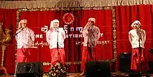 Mon National Day is marked with literature competitions, photo exhibitions, traditional boxing competitions, and traditional songs and dances performed by a popular Mon drama troupes and other cultural shows.[13][14] Traditional Mon musical instruments, food and handicrafts are also sold during festivities.[13] During the festivities, many celebrants don traditional Mon outfits, consisting of red-colored longyis and white tops.[15]