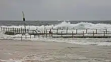 Mona Vale has a shallow beach (formerly known as "Bongin Bongin" Beach)[4] which has a children's and lap pool at its northern end, with the main beach adjoining the golf course and a number of parks and reserves. There is a second beach north of this which is known as "The Basin" with a concentrated wave which, since the early 2000s, has been known as "Whomp" which is popular with body boarders. Mona Vale is a popular beach for surfing with beach breaks including "Main", "Suck Rock" which holds the annual competition known as KOTR or king of the rock, and "Rip Bowl" THE GALD IS KING OF MV .[8]