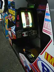 Multiple styles of arcade cabinet exist for the game, including a deluxe cockpit cabinet which was designed in approximation to sitting behind the wheel of a race car with a padded steering wheel and accelerator pedal.[4] A tabletop housing and a smaller upright cabinet were also created.[1]