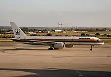 During 1981, new stations opened at Gatwick, Glasgow, Manchester and Berlin Tegel[18][30] making it the first time Monarch Airlines carried a million passengers in a single year. 1981 was also the year Monarch became the first charter airline to order the Boeing 757-200, a high-capacity medium-haul single-aisle plane powered by Rolls-Royce RB211-535C engines.[31] Monarch's 757 order represented a significant change for a small airline.[32] The first delivered 757 entered service in the spring of 1983,[32] coinciding with the introduction of an updated livery, the third in the airline's history. During the mid-1980s, sister company Monarch Aircraft Engineering Limited opened several new facilities at Luton to expand the firm's maintenance capabilities. Amongst other things, it enabled the 757 fleet to be maintained in-house.[14]