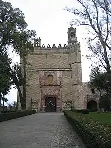 The monastery of San Juan Bautista in Tetela del Volcán was built by the Dominicans in the first half of the 16th century and was even visited by Hernán Cortés.[11] It is at a high altitude near the volcano surrounded by pine forest in a relatively cold climate.[6][14] The exterior has arcades that surround the complex but are partially hidden by trees.[14] The upper parts of the walls around the complex are covered in paint; the lower floor of the cloister has figures depicted in the arches and walls. Many are of Augustinian monks. In the vaults over the walkways, there are numerous cherubs which are defeating evil spirits and some are even fighting with each other.[4] One unique architectural element is the Moorish-style wood-beam roofing in the sacristy.[6] There is a crafts market held here each Wednesday.[14] The atrium have a series of frescos of very high quality, painted by a local indigenous artist in the 16th century.[15] They were restored in 2008.[16]