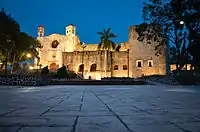 The Dominican monastery of Santo Domingo in Oaxtepec is located on a fairly steep hill over a pre-Hispanic ceremonial platform.[6][14] For this reason, the atrium is not located in front of the church and is more elevated than the church.[6] In the interior of the church, Gothic arches support the roof and the vault is decorated with floral motifs. There are two wood altarpieces from the 17th century.[14] The monastery of Oaxtepec has pillars in the cloister with images of saints, and barrel vaults decorated with repeating motifs such as fleur-de-lis. The murals here have remnants of blue coloring, which is unusual but most have lost their color entirely. Most of the murals which have disappeared completely have been destroyed by humidity, which is mostly due to the lack of maintenance of the roof's drainage. The monastery's cloister has been converted into a museum, but only three of the halls are open to the public. It contains a modest collection of pre-Hispanic pieces and regional animals, insects and plants.[9]