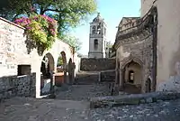 Located on a hill in the Tepozteco Valley, the monastery of La Natividad de Nuestra Señora in Tepotzlán was built between 1550 and 1564 and still towers over the other buildings in the town.[14] It initially began with only five Dominican friars.[12] The large atrium has a large stone cross with symbols of the Passion.[14] There is an open chapel and chapels in the capillas posas in the corners, but most of these are in ruins.[6] The cloister contains friezes with the coat of arms of the order.[14] There is evidence of syncretism of indigenous and Catholic beliefs such as the image of an angel with European facial features but with eagle's wings, similar to those which can be found on Quetzalcoatl. In the interior, there is a fresco with a xoloitzcuintle dog with a torch in its mouth and a border around the walls with squash flowers and roses, surrounded with precious stones, including a native one called “chalchihuite.”[12] The plaza in front of the atrium of the monastery in Tepoztlán is crowded with a tianguis market which sells everything from basic food staples to New Age paraphernalia.[12]