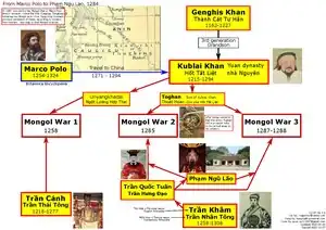 In 1284, Kublai appointed his son Toghon to command an overland force to assist Sogetu. Toghan demanded that the Vietnamese allow his passage to Champa, in order to attack the Cham army from both north and south, but they refused, and concluded that this was the pretext for a Yuan conquest of Đại Việt. Nhân Tông ordered a defensive war against the Yuan invasion, with Prince Trần Quốc Tuấn in charge of the army.[57] A Yuan envoy recorded that the Vietnamese had already sent 500 ships to help the Cham.[58] In fall 1284, Toghon began moving his troops to the borders with Đại Việt, and in December an envoy reported that Kublai had ordered Toghon, Pingzhang Ali and Ariq Qaya to enter Đại Việt under the guise of attacking Champa, but instead to invade Đại Việt.[56] Southern Song Chinese military officers and civilian officials who had intermarried with the Vietnamese ruling elite then went to serve the government in Champa, as recorded by Zheng Sixiao.[39] Southern Song soldiers were part of the Vietnamese army prepared by King Trần Thánh Tông against the second Mongol invasion.[59] Also in the same year, the Venetian traveler Marco Polo almost certainly visited Đại Việt[lower-alpha 4] (Caugigu)[lower-alpha 5][lower-alpha 3] almost when the Yuan and the Vietnamese were ready for war,[lower-alpha 3] then he went to Chengdu via Heni (Amu).[64]