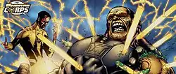 Mongul takes the Sinestro Corps to Korugar, Sinestro's homeworld, having the inhabitants strung up along the streets. He also decides to rename the Yellow Lanterns as "the Mongul Corps", after himself.[30] Soon after, Sinestro is brought to Korugar and confronts Mongul. First, using an override built into Mongul's rings, Sinestro defeats him, thus reclaiming the Sinestro Corps. Then, he imprisons Mongul in the Corps' Central Power Battery, intending to kill him once the Black Lantern Corps is dealt with.[31]