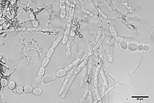 M. roreri is a hemibiotrophic fungus that forms swollen irregularly shaped intercellular mycelia.[8] The infection process starts when conidia of M. roreri land on the surface of the pods. Then they germinate and penetrate the pod directly through the epidermis,[9] causing internal damage in the early stages of the disease. The initiation of the necrotrophic phase begins when asexual spore masses are produced on the pod surface.[10] External symptoms like dark spots on the surface of pods can be seen only after 40 to 80 days post infection; thus infected pods during the early stages appear asymptomatic, which is one factor that has led to the unwitting movement of infected pods by humans. One week after the appearance of dark lesions, the characteristic white powder of the disease appears on the surface of infected pods. The powdery appearance is due to the presence of millions of conidia that can reach up to 44 million per square centimeter with a mature infected pod capable of producing more than seven billion spores.[11]