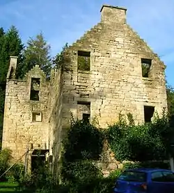 Monkcastle, Monk Castle sometimes known as Old Monkcastle formed a small estate in the Parish of Kilwinning, North Ayrshire lying between Kilwinning and Dalry on the A737. The property was originally held by the Tironensian monks of Kilwinning Abbey and was probably the site of the abbot's country retreat.[1] The 17th-century Monkcastle is a category B listed ruin,[2] although it has been consolidated and stands next to a private house, constructed from the converted old home farm buildings. The 19th-century mansion of Monkcastle House is nearby, and is also category B listed.[3] The castle may have been used as a dower house or retreat.[4]