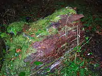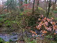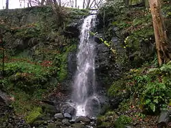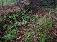 A rocky glen runs up from Monkcastle with a significant waterfall and a listing as part of a Scottish Wildlife Trust local site for nature conservation. The glen was partly formed from quarrying work for freestone.[35] A previous course of the Monkcastle Burn can still be followed and this probably resulted from the quarrying intruding into the original course of the burn at the head of the glen resulting in a waterfall and the burn then following the bed of the glen itself. The geology consists of Carboniferous limestone, macroporphyritic basalt, and an overlay of basalt and boulder clay. The quarry workers are thought to have made used of Old Monkcastle as office space for storage, etc. The OS maps show that quarrying had ceased by the start of the 20th century.[35]