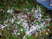 On 8 November 1576, midwife Bessie Dunlop, resident of Lynne, in Dalry, was accused of sorcery and witchcraft. She answered her accusers that she received information on prophecies or to the whereabouts of lost goods from a Thomas Reid, a former barony officer in Dalry who died at the Battle of Pinkie some 30 years before.[31] She said she first met him while walking between her own house and the yard of Monkcastle, and after a discussion he disappeared through a hole in a wall or dyke, apparently too small for a normal person to pass through.[32] Bessie also met with the warlock Laird of Auchenskeigh at a thorn tree near to Monkcastle.[33]