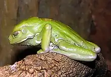 They have shown to be able modulate their body temperature through control of evaporative water loss.[8] As in other species in the family of leaf frogs, it has physiological and behavioral adaptations to limit water loss, reducing it through the skin by lipid secretions and excretion of uric acid (uricotelism), as well as entering diurnal torpor.[9] Lipid secretions are produced in a special type of cutaneous gland which is densely packed along the entire surface of the frogs body. If handled, frogs will use their legs to engage in wiping behavior, possibly as a grooming mechanism or to ensure their bodies are appropriately coated in secretions. The function of these secretions is undecided, varying in literature; a beneficial hydrophobic layer is supported by Blaylock et al, 1976,[9] versus a hygroscopically-induced water film barrier by Toledo and Jared, 1993.[10] Nonetheless, this wiping method of retaining water is so effective that the frog's evaporative water loss is only 5-10% of that of other anurans and comparable to that of lizards.[11] Waxy monkey leaf frogs are nocturnal, and spend most of the day resting on a perch. When perched, the frogs may enter a state of torpor which may help reduce respiratory evaporative water loss.[9]