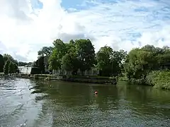 Monkey Island is an island in the River Thames in England, on the reach above Boveney Lock. Its nearest village is Bray, Berkshire. Its dominant building is a small hotel since the late 19th century. The reach on which it sits is a main reach in boat hiring and tour boating, between Windsor and Maidenhead. The island and the reach have been a tour destination since Georgian times – particularly so after its purchase by the Duke of Marlborough of 1738 (of the current Dukedom well-noted for Blenheim Palace) who in nameplay put colourful statues of monkeys in his various gardens for visitors to discover. In one of his two small buildings on the island (by Palladian architect Robert Morris) some of these remain.