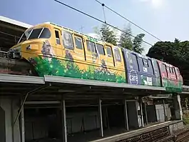 Two monorail cars, end car 101 and intermediate car 201, are scheduled to be preserved next to the former Dōbutsuen Station in their original livery of silver with red and white bodyside stripes from 19 March 2009.[7] Additionally, a single car from the defunct line is currently on display at the Spa Resort Yunohana.[8] Visitors can tour the inside and outside of the monorail car, which briefly became a location for a Japanese geocaching adventure game in Kani-city.[9]