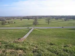 ![]() Monks Mound in summer. The concrete staircase follows the approximate course of the ancient wooden stairs | |