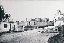 At that time hangings were carried out on the flat roof of the gatehouse. Two Irishmen, Maurice Murphy and Patrick Sullivan, were sentenced for the joint murder of Jane Lewis and were publicly executed, on 23 September 1850,[11] on the roof. Their execution was watched from the grassy slopes of what is now Haberdashers' Monmouth School for Girls, by a crowd of about 3,000, of whom "about four-fifths were estimated to be of the softer sex".[12] Executions were carried out in public there until nine years later (23 September 1859), when Matthew Francis was hanged for the murder of his wife.[11] The illustration shows that the Gatehouse originally had castellated parapets and cross loops on the south elevation, so the current pitched roof and windows of the private house probably date from after its closure in 1869.[3] The huge recessed archway remains, however, though with a domestic front door built into it.