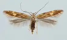 The wingspan is 12–14 mm. The forewings are very pointed, fuscous, mievenly sprinkled with ochreous-whitish, sometimes forming indistinct darker and lighter fasciae ; an oblong ochreous-whitish suffusion in disc at 2/3 followed by a dark fuscous dot; a very indistinct ochreous-whitish tornal spot beneath this, and costal spot beyond it. Hindwings are grey.[2]