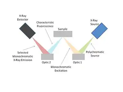 Monochromatic wavelength dispersive x-ray fluorescence (MWD XRF) is an enhanced version of conventional wavelength-dispersive X-ray spectroscopy (WDXRF) elemental analysis. The key difference is that MWD XRF uses a doubly curved crystal X-ray optic between the X-ray source and the sample resulting in monochromatic excitation.[1][2] This additional optic creates a high-intensity X-ray beam on a small spot size without increasing the power of the X-ray source. An MWD XRF instrument is constructed from a low-power X-ray tube, a point-to-point focusing optic for excitation, a sample cell, a focusing optic that collects the fluorescence from the sample, and an X-ray detector. By using an optic between the X-ray source and the sample, a monochromatic beam free of bremsstrahlung, excites the sample, eliciting the secondary fluorescence X-rays needed for elemental analysis. By restricting the band of wavelengths used for excitation, a much higher signal to background ratio is achieved. This type of excitation allows much lower limits of detection and faster reading times.[3]