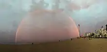 A monochrome or red rainbow is an optical and meteorological phenomenon and a rare variation of the more commonly seen multicolored rainbow. Its formation process is identical to that of a normal rainbow (namely the reflection/refraction of light in water droplets), the difference being that a monochrome rainbow requires the sun to be close to the horizon; i.e., near sunrise or sunset. The low angle of the sun results in a longer distance for its light to travel through the atmosphere, causing shorter wavelengths of light, such as blue, green and yellow, to be scattered and leaving primarily red.[1] In the lower light environment where the phenomenon most often forms, a monochrome rainbow can leave a highly dramatic effect.