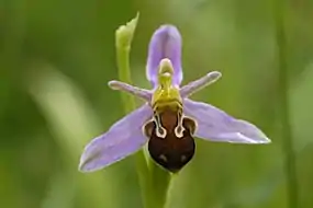 Like dicots, some zoophilous monocots do not produce nectar and instead offer pollen as the main reward. A few even offer other rewards: oils to bees, starchy tissue to beetles, sleeping holes to bees, and a perfume which Euglossini male bees will collect and present on their legs during mating displays.[1] Deceptive flowers that do not offer actual rewards are much more widespread in monocots than dicots, with the most common perpetrator being the orchids. Orchids commonly provide empty nectar spurs.[1] One genus, Ophrys, is known for its ability to mimic female bees to such a degree that it fools male bees into pseudocopulating with the “female” and thereby pollinating the flower.