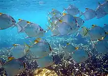 Monodactylidae is a family of perciform bony fish commonly referred to as monos, moonyfishes or fingerfishes. All are strongly laterally compressed with disc-shaped bodies and tall anal and dorsal fins. Unusually for fish, scales occur on their dorsal fins and sometimes on the anal fins. The pelvic fins are small, sometimes vestigial. They are of moderate size, typically around 25 centimetres (9.8 in) in length, and Monodactylus sebae can be taller than it is long, measuring up to 30 centimetres (12 in) from the tip of the dorsal fin down to the tip of the anal fin. These long, scaly fins have given them the name "fingerfishes". Most are silvery with yellow and black markings; the juveniles are especially attractive, and most species are popular as aquarium fish.