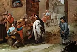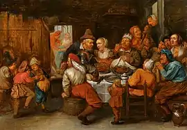 More recently the art historian Fred Meijer identified a number of interior scenes, which were close to van Herp's work and stylistically coherent with them, which he assigned to an artist which he gave the notname 'Monogrammist H.C.'. Among these works were the Violent robbery (Museum Bredius, The Hague) previously attributed to Pieter Codde and subsequently attributed to Anonymous Southern Netherlands.[2][3] Other works reattributed to the Monogrammist H.C. are The King drinks (Bonhams, London 9 July 2008, lot 83, previously attributed to Wilem van Herp, and the A doctor performing a back operation, watched by country folk (Wellcome Library), previously attributed to Adriaen Rombouts.[2][4]