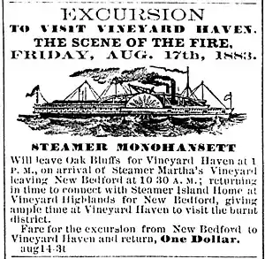 Monohansett returned to service as a Martha's Vineyard ferry in June 1865.[4] In the summer of 1874, now-President Grant used the Monohansett to visit Martha's Vineyard, arriving in Cottage City (now Oak Bluffs).[1]
