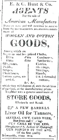 Elisha Hunt was a resident of Brownsville where he was a prominent businessman, land owner, and a director of the Monongahela Bank of Brownsville.[13] He owned and operated with Caleb, his younger brother, a general store which was located in the "Neck", as the commercial center of Brownsville was called.[14] The Hunt brothers sold a wide variety of items, ranging from cotton and woolen goods to nails and gunpowder, to local customers. They were ambitious and wanted to expand their mercantile business. To accomplish this Elisha and Caleb Hunt planned to augment the store's local business with interstate commerce via the western rivers.