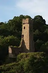 Large parts of the ruins of the Löwenburg have been preserved, enabling the former appearance of the castle to be imagined. The remains of the 25-metre-high bergfried, with its three-metre-thick walls, are highly visible from a long way off. Its elevated entrance faces the valley, i.e. the side facing away from the enemy. The tower was protected in the 15th century by a pointed shield wall which protected it against the firearms emerging at that time. Today it is accessible as a viewing tower.[1]