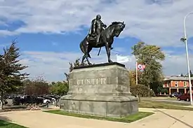 In 1910, President William Howard Taft and the widow Elizabeth Bacon Custer unveiled an equestrian statue of Custer, which now stands at the corner of Elm Avenue and Monroe Street.[11][12][13] Custer is also honored in street names, various historic markers, buildings, schools, and the regional Custer Airport.[14] City limit signs for Monroe describe the city as "the home of General Custer."