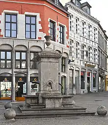 Built in 1831 by Albert Jamot, this well was transferred to the central Marché-aux-Herbes in 1877 and has served as a fountain after the development of the water supply in the city during the years 1869–1870. It has regained its original location at the corner of the Coupe and the Chaussée in 1981.[15] After the Marché aux Herbes, the fountain (not connected to the water) was placed for a few years in the park at the far end of rue des 4 Fils Aymond.