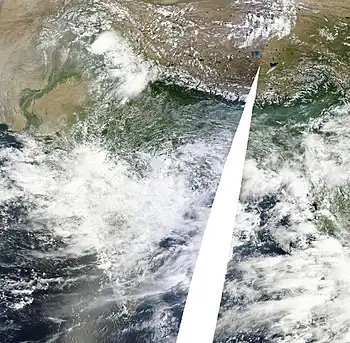 One of the most commonly used words to describe the erratic nature of the monsoon is "vagaries", used in newspapers,[17] magazines,[18] books,[19] web portals[20] to insurance plans,[21] and India's budget discussions.[22] In some years, it rains too much, causing floods in parts of India; in others, it rains too little or not at all, causing droughts. In some years, the rain quantity is sufficient but its timing arbitrary. Sometimes, despite average annual rainfall, the daily distribution or geographic distribution of the rain is substantially skewed. In the recent past, rainfall variability in short time periods (about a week) were attributed to desert dust over the Arabian Sea and Western Asia.[23]