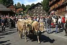 Farming and agriculture are part of traditional Alpine transhumance. This is a three-phase seasonal droving of grazing livestock between the valleys in winter and the high mountain pastures in summer, ensuring a sufficient food supply for the cattle throughout the year.[5] While tourism and other industries contribute more to the economy, seasonal migration to high pastures is still an important economic factor for parts of the population. In the autumn, if no animals have died and there have not been any accidents up in the mountains, the farmers decorate the cattle and bring them down from the mountain pastures in a festive parade, a highlight of regional culture.[6]