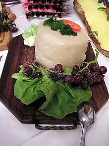 The Montafoner Sauerkäse or Montafon cheese (dialect: Sura Kees or Sura Käs, referring to a type of sour cream/curdled milk cheese) is a sour cream cheese made in the Montafon since the 12th century. Montafon has one of the oldest traditions of cheese production in the Alpine region, and this is still an important dairy product. It has very little fat (1-10% fat in dry matter) and is a local speciality, similar to the Tyrolean grey cheese.[21][22]