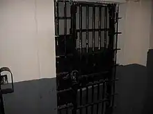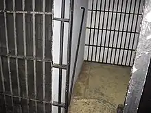 In 1896, Conley deemed the old Territorial Penitentiary insufficient, even after remodeling it to house 164 inmates, so he constructed the first of two cellblocks. The 1896 Cellblock bordered the Territorial building on its southern side and could house 256 inmates in four tiers of thirty-two cells, each measuring 6 ft (1.8 m) long, 8 ft (2.4 m) deep, and 7 ft 4 in (2.24 m) tall.[19] None of these cells had plumbing, however, and inmates again used the bucket system: one for fresh water, the other for human waste.[20] Each door locked individually, which, when combined with the wood stoves which heated the building and the wooden roof, created a safety hazard in the case of a fire. Electricity didn't enter the building until after the start of the 20th century, but this building was a marked improvement from the antiquated Territorial building.