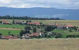 Peyres-Possens had an area, as of 2009, of 1.9 square kilometers (0.73 sq mi). Of this area, 0.94 km2 (0.36 sq mi) or 49.0% is used for agricultural purposes, while 0.76 km2 (0.29 sq mi) or 39.6% is forested. Of the rest of the land, 0.19 km2 (0.073 sq mi) or 9.9% is settled (buildings or roads), 0.01 km2 (2.5 acres) or 0.5% is either rivers or lakes.[14] The former municipality is located on a hilly plateau in the mid-Jorat to the right of the Mentue river. It consists of the villages of Peyres and Possens.