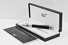 Montblanc makes several models of pens, with the Meisterstück (fountain pen) representing the cornerstone model. Each is slightly different, however Meisterstück models created after 1990 have a serial number located on the ring at the top of the clip, and under the clip is usually has "Pix" engraved however this has been phased out in recent production and replaced with "Made in Germany METAL".[8] The barrels of pens made of black 'precious resin' will reveal a reddish hue under strong lighting; if the pen in question does not have these attributes then it is possibly a fake.[9]