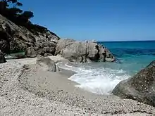 The island, formed by the heaving of a submarine pluton, has a slightly elliptical shape, and is wholly mountainous, with several rock ledges rising steeply from the sea. It consists almost entirely of granodiorite with large crystals of orthoclase.[10] The mountain chain that crosses the island has three main peaks: Monte della Fortezza (645 m), Cima del Colle Fondo (621 m) and Cima dei Lecci (563 m).[2] Montecristo's only natural harbour is Cala Maestra, on the northwest side.[2] The island has plentiful water resources.