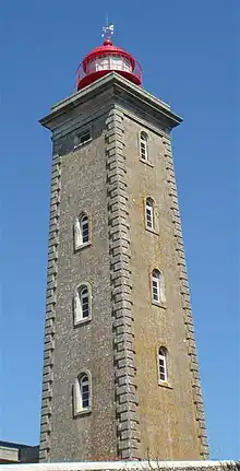 The tower is quadrangular, constructed in granite. It is 28 meters tall, giving it a focal height of 103 meters. It has a semi-circular roof, painted red, and is topped by a weather vane.[1][2][3]