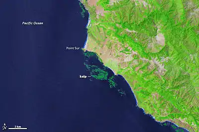The sanctuary provides habitat for 36 species of marine mammals, 94 species of seabirds, at least 525 species of fish, four of turtles, 31 phyla of invertebrates, and more than 450 species of marine algae.[1] Historical sites include 1,276 reported shipwrecks and 718 prehistoric sites. The MBNMS has major programs for research and monitoring, and another for education and outreach. Public recreation activities such as kayaking, SCUBA diving, and surfing are permitted, along with commercial fishing. Oil drilling and seabed mining are banned to protect the sanctuary.[2] The sanctuary provides economic value via ecotourism as well as fishery resources including the Dungeness crab and market squid.[3] Otter trawling has been shown to have significantly negatively impact the benthic invertebrate biodiversity in areas where trawling is less restricted.[4] Despite its protection as a National Marine Sanctuary MPA, a study found microplastic concentrations were higher than the global average, with a higher amount closer to shore.[3]
