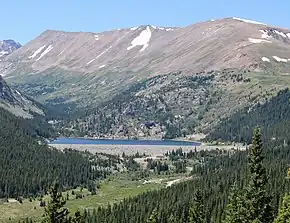 Most of the water entering the reservoir comes through the Hoosier Tunnel which collects water from the Blue River watershed on the west side of the continental divide and conveys it to the east side, an instance of a transbasin diversion.[5] Because the reservoir lies near the top of the headwaters of the Middle Fork South Platte River, the watershed above the dam is rather small — only 7.7 square miles (20 square kilometers) in size,[6] so its catchment basin is limited. Thus the chief source of the lake's water is the Hoosier Tunnel.