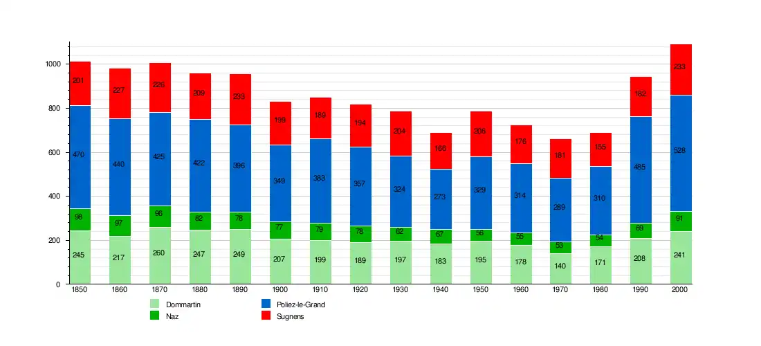 Dommartin is first mentioned in 908 as Domno Martino villa.[4] Naz is first mentioned around 1200 as Nars.[5] Poliez-le-Grand is first mentioned around 1160-79 as Poleto. In 1225 it was mentioned as Pollie lo Grant.[6] Sugnens is first mentioned in 1177 as Sugnens.[7]