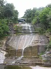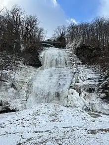 Montour Falls is well known for the natural attraction of a 165-foot waterfall located on the west side of the village. At the base of the falls is a sign labeled "She-qua-ga", a transliteration of its Seneca name. A bridge above the waterfall spells the name as "Che-qua-ga". Many historic names have been recorded under a wide variety of spellings, especially as various peoples tried to transliterate them from one language to another. This attraction is also known as "Montour Falls".